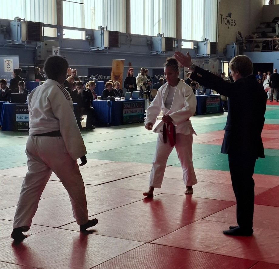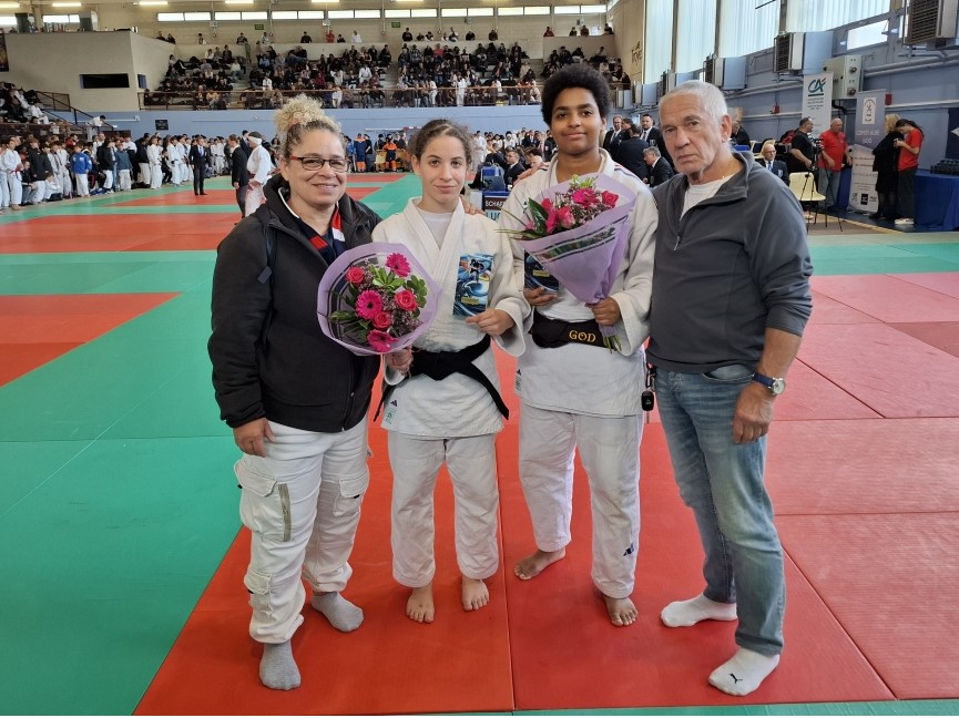 23 octobre, toujours accompagnée de son père et de Yves son entraîneur de club, Alyson termine sur la 1ère marche du podium après 5 combats difficiles.